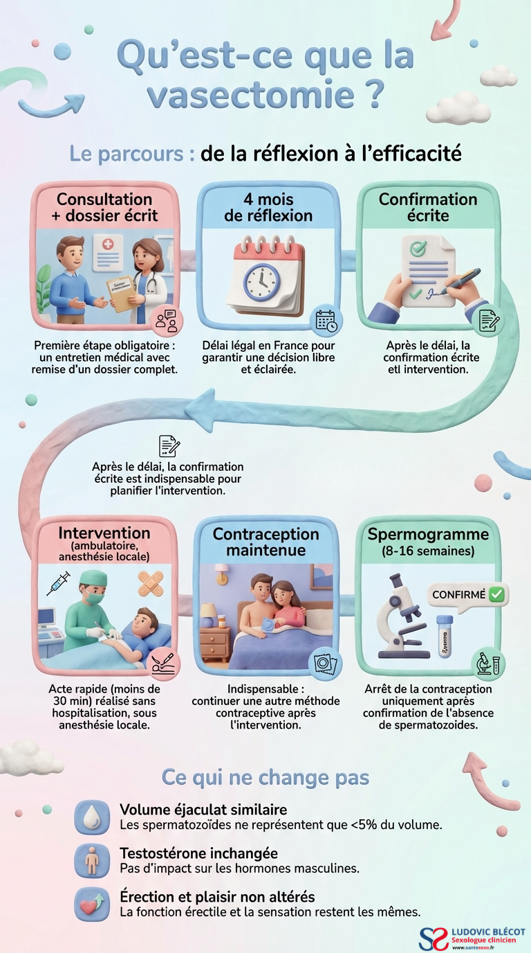 La vasectomie ne peut être pratiquée qu’après un délai légal de réflexion de 4 mois. Cette exigence vise à garantir une décision pleinement éclairée et libre.